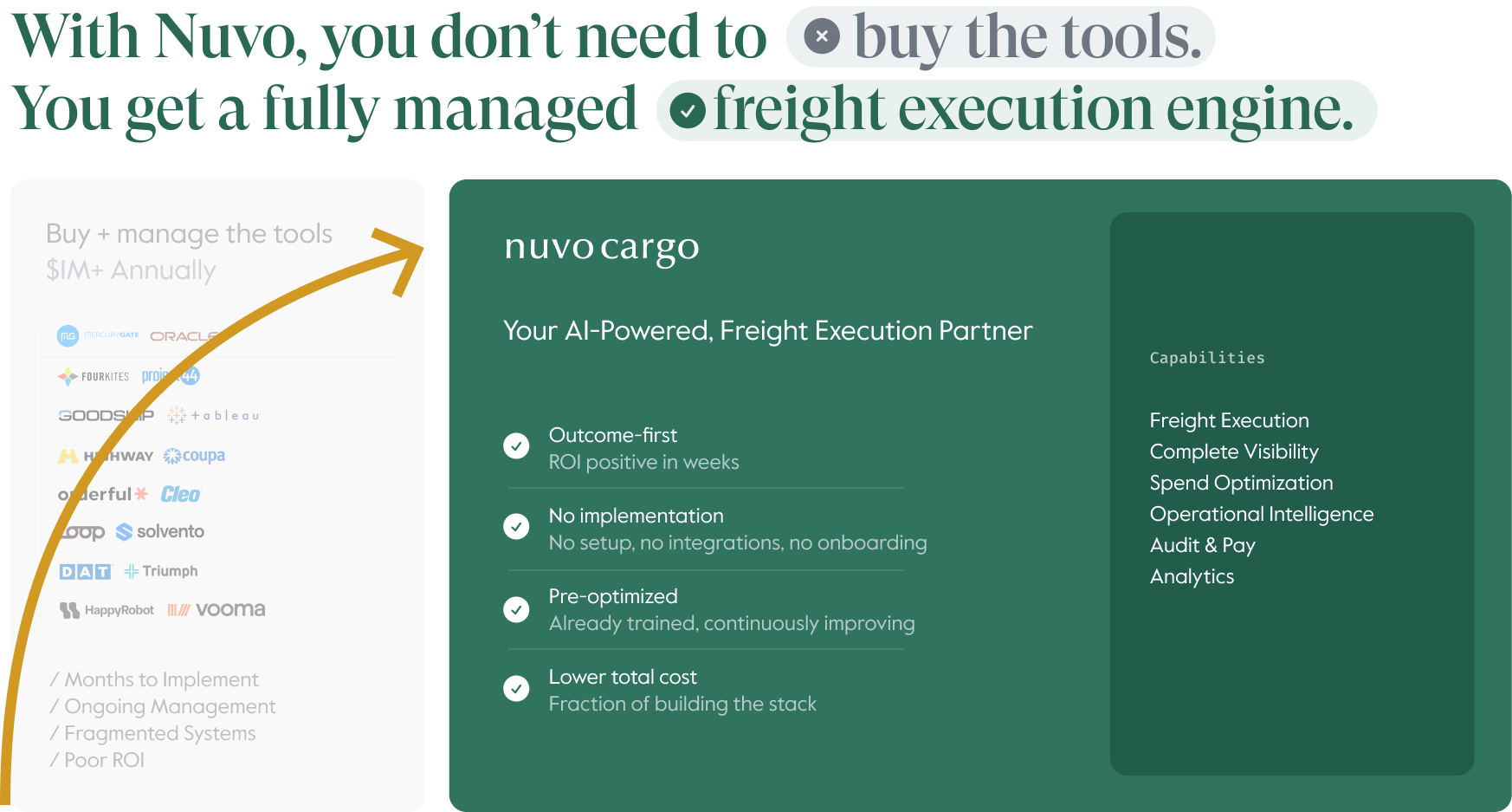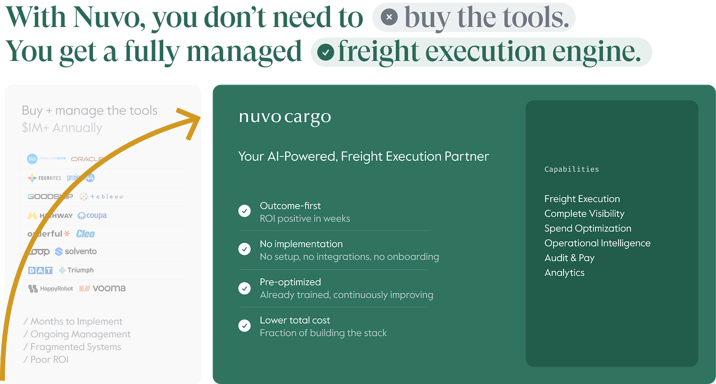 We firmly believe the future needs to be something seamless and simple — a single platform that gives you the benefit of all 15 or 20 of these tools and drives real outcomes, without the sprawl. That’s what we’ve built with Nuvo AI, and we’ll also go deeper on that in a subsequent post on how to simplify your logistics tech stack.