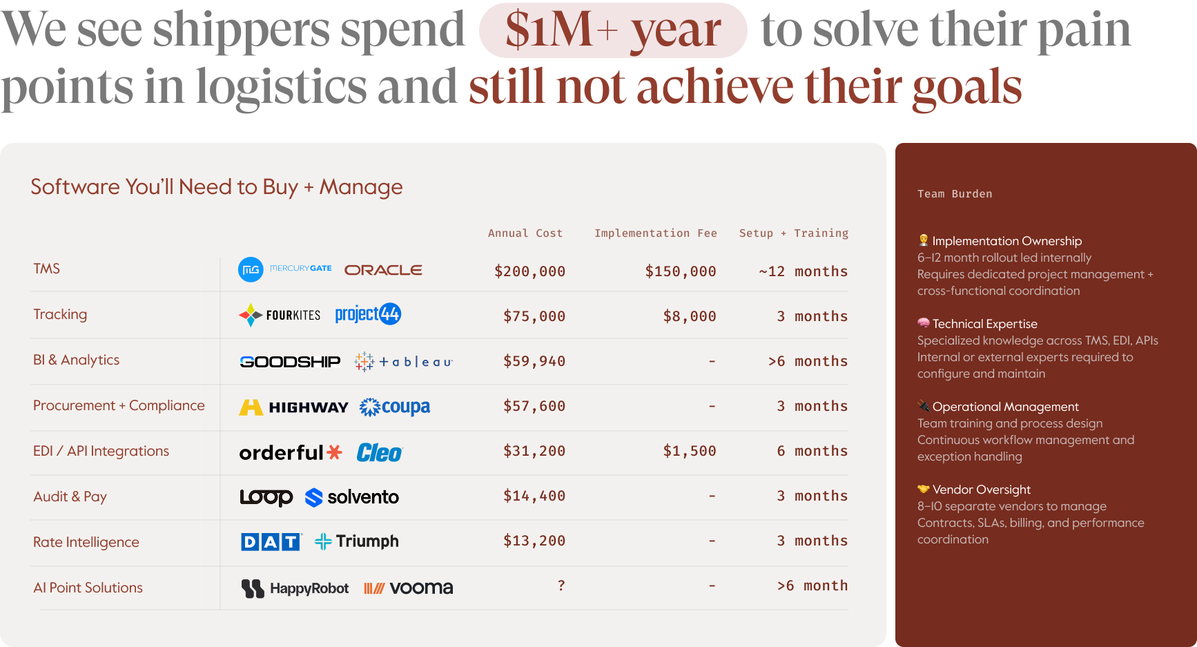 First you implement a TMS like Oracle OTM or MercuryGate. Then you add a visibility platform like project44 or FourKites. A rate benchmarking tool like DAT, Greenscreens, or Sonar. A bidding platform like Emerge, Coupa, or Jaggaer. A carrier compliance solution like Highway or GenLogs as fraud becomes rampant in the space. Something to handle EDI and integrations. Freight audit and pay. BI and analytics. Middleware to connect it all. And now, with the boom of AI, you’re getting pitched by a dozen new solutions launching every month from AI appointment scheduling, AI quoting, to voice AI agents for carrier negotiation, and more; this creates more complexity, not less.
