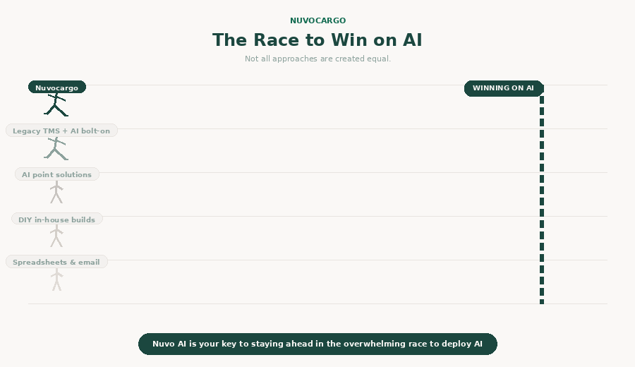 Our shippers don’t have to waste their time thinking about the 25th new vendor or the latest update from OpenAI or Anthropic. That’s all out of the box with Nuvocargo — completely applied to your freight, always driving the best outcome at the best cost. We’ll share more about how we help our shippers stay on the bleeding edge of AI in a separate subsequent post.